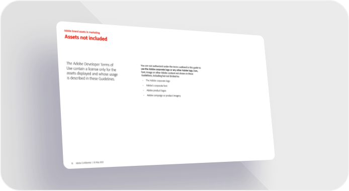 Adobe brand assets in marketing Assets not included The Adobe Developer Terms of You are not authorized under the terms outlined in this guide to Use contain a license only for the use the Adobe corporate logo or any other Adobe logo, icon, font, image or other Adobe content not shown in these assets displayed and whose usage Guidelines, including but not limited to: is described in these Guidelines. • The Adobe corporate logo • Adobe's corporate font • Adobe product logos • Adobe campaign or product imagery 16 Adobe Confidential | 03 May 2023
