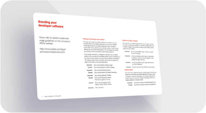 Branding your developer software Please refer to Adobe’s trademark Naming and referring to your product Product icon, logo, or imagery usage guidelines on the company’s You may not include any Adobe trademark, in whole or in part, You may not use an Adobe logo, product icon or image, in whole official website: an abbreviation of an Adobe trademark, or any word or design or in part, or any similar variation, in a preview image, product icon confusingly similar to an Adobe trademark in your company or feature image for your product, except by prior, written license name, trade name, product name, domain name, or name of your agreement from Adobe. https://www.adobe.com/legal/ offering. Do not use the abbreviation "CC" for Creative Cloud with Incorrect: Do not use the Adobe logo, in whole or in part, permissions/trademarks.html your product name to associate it with Adobe products. in your icon design. If your plugin, extension, or integration operates with an Adobe Incorrect: Do not use Adobe product logos or trademarks, product, you may refer to the Adobe product name or trademark in in whole or in part, in your icon design, i.e. the the name of your product or service only to indicate compatibility. Adobe PDF logo or file icon. The Adobe product name should be used in full as outlined on page 8, and shown in the examples below. Incorrect: Do not use Adobe product logo abbreviations, Incorrect: [Your name] Adobe InDesign plugin i.e. Ps for Photoshop. Correct: [Your name] plugin for Adobe InDesign Incorrect: Do not mimic the style of Adobe product logos. Incorrect: [Your name] Photoshop Action Domain names Correct: [Your name] Actions for Adobe Photoshop You may create a dedicated product landing page, but the domain Incorrect: [Your name] Lightroom Presets name may not include any Adobe trademark or product name, Correct: [Your name] Presets for Adobe in whole or in part, an abbreviation of an Adobe trademark or Photoshop Lightroom Classic product name, or any word or design confusingly similar to an Adobe trademark or product name. Correct: [Your name] integration with Incorrect: www.[Your Company name]andAdobeXD.com Adobe Creative Cloud Libraries Correct: www.[Your Company name].com/PluginforXD Incorrect: [Your name] CC 5 Adobe Confidential | 03 May 2023