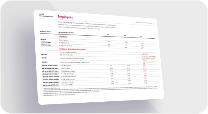 Key ESG Performance Indicators 19 2021 Adobe Corporate Social Responsibility Report Employees How we treat and engage with our employees is a crucial element of our corporate social responsibility efforts. We work to ensure an employee base that is diverse and inclusive of the community, and that each individual is treated equally with opportunities to learn, grow, and advance in their careers. REFERENCE INDICES KEY PERFORMANCE INDICATOR 2019 2020 2021 Employees GRI 102-7 Global employees 22,634 22,516 25,988 SASB TC-SI-330a.1 % employees in US 52% 52% 52% * SASB TC-SI-330a.1 % employees outside US 48% 48% 48% * Employee diversity and inclusion † Diversity and inclusion overview Adobe For All GRI 205-1 Anti-discrimination policy Adobe Code of Business Conduct GRI 405-1 Diversity of governance bodies and employees Governance bodies: 2021 Proxy Statement GRI 405-2 Ratio of basic salary and remuneration of women to men Adobe Diversity & Inclusion— Parity GRI 102-8, SASB TC-SI-330a.3 % female employees 33.1% 33.4% ‡ 33.8% GRI 102-8, SASB TC-SI-330a.3 % male employees 66.6% 66.3% 65.5% GRI 102-8, SASB TC-SI-330a.3 % female people managers 29.1% 28.9% 30.7% GRI 102-8, SASB TC-SI-330a.3 % male people managers 70.7% 71.0% 69.1% GRI 102-8, SASB TC-SI-330a.3 % female leaders (director+) 24.9% 26.1% 25.4% GRI 102-8, SASB TC-SI-330a.3 % male leaders (director+) 75% 73.9% 74. 5% GRI 102-8, SASB TC-SI-330a.3 % females in tech roles 25.4% 25.8% 26.2% GRI 102-8, SASB TC-SI-330a.3 % males in tech roles 74. 3% 73.9% 73.3% * Figures are as of December 3, 2021. † Data reflects Adobe employees who have voluntarily disclosed their gender and US race and ethnicity data. <1% of our global employee base hadn’t disclosed gender data and <5% of our US employee base hadn’t disclosed race and ethnicity data. Starting in FY2021, an updated methodology was applied to calculate diversity metrics. Our metrics now represent the total global workforce, inclusive of those who choose not to self-identify their gender and/or race and ethnicity data. In prior years, Adobe reported representation as a percentage of the workforce who self-identified their gender and/or race and ethnicity data. With this shift, we’re using a larger data set in our calculation. ‡ Reporting data to one decimal point began with FY2020 reporting.