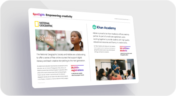9 2021 Adobe Corporate Social Responsibility Report Spotlight: Empowering creativity The National Geographic Society and Adobe are collaborating to offer a series of free online courses that support digital literacy and teach creative storytelling to the next generation. As students and educators have become accustomed to online education, our on-demand Photography, Video, Audio, and Graphics courses have continued to grow in popularity. We’re proud of the recent announcement that the Storytelling for Impact courses created in partnership with the National Geographic Society will win Gold at the 2022 Anthem Awards in the Product, Innovation, or Service (Not-for-Profit) category. 28,000+ registrations in the first six months after the program launch Photo by Ryan Hill Adobe is proud to be Khan Academy’s official creativity partner. As part of a multi-year agreement, we’re working together to provide students with high-quality educational resources and fluency in creative skills. Our Teach Creativity with Adobe and Khan Academy course supports teachers’ professional development, giving them access to over 20 hours of training and offering a certificate for completion. 2.8 million+ students supported around the world through this effort