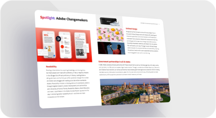 11 2021 Adobe Corporate Social Responsibility Report Adobe Changemakers Spotlight: Readability Reading is foundational to acquiring knowledge and sharing ideas, but most people can’t read with proficiency. In fact, a majority of adults in the US ages 16 to 74 lack proficiency in literacy, reading below a 6th-grade level, and the first year of the pandemic brought the number of children who struggle with reading up to 500 million worldwide. Adobe’s Readability Initiative is helping address this worldwide problem through targeted research, product development, and partnerships with University of Central Florida, Readability Matters, World Education, and more. Liquid Mode in the Adobe Acrobat Reader app was the first step in delivering better readability for all—and there are more innovations on the horizon. Enlisted Design Recognized by Fast Company as one of the top design firms in the world, Enlisted Design works with Adobe's 3D modeling and immersive applications and across Illustrator and Photoshop to understand how consumers interact with products and how they can bring joy to that experience through sustainable practices— like using compostable materials, plant-based inks, bio-plastics, FSC certifications, and more. Through its work, Enlisted Design seeks to broaden the standard definition of sustainability, inspiring the partners it works with to seek sustainable business solutions to pressing global issues such as coal burning. Government partnerships in all 50 states In 2021, Adobe proudly achieved partnership with Federal Government as well as individual agencies at the state, county, and city levels in all 50 states to empower digital modernization. Through a combination of Adobe Experience, Document, and Creative Cloud solutions, our various partnerships have enabled government agencies to streamline COVID-19 testing, distribute vaccine information to constituents, power the first-ever online decennial Census, efficiently pivot to remote workstreams, shift to paperless processes to conserve natural resources, and more.