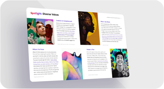 8 2021 Adobe Corporate Social Responsibility Report Spotlight: Diverse Voices Creators in ComplexLand Adobe joined Complex Networks’ inaugural ComplexLand virtual festival in December 2020 to highlight five emerging Black creators, putting their work on full display throughout the five-day digital experience. Bria Nicole , Philip Kaiten , Juan Veloz , Justine Mangum of Winnie Weston , and Dana Scruggs all showcased their work within the Adobe Creativity Space, garnering over 1 million views, 138,000 visits, and 230,000 engagements. When I See Black For the next generation of Black creators, seeing themselves and the full spectrum of Black creativity is crucial. We’re proud to share When I See Black , an homage to the spectrum of the Black experience that’s told through the eyes and voices of Black creators and set to Gregory Porter’s track, Revival . The piece features artwork from Esther Luntadila , Crystal Kayiza , Temi Coker , Barr y Yusufu , Devin Wesley , Aurélia Durand , Shani Crowe , Yannis Guibinga , Asia Hall , Lawrence Agyei , Ismail Zaidy , and Joshua Kissi , and it’s been shown across Hulu with 59 million impressions as of December 2020. Where I’m From Where I’m From explores the rich and varied stories that arise from answering the question: “Where are you from?” In this film, Asian and Pacific Islander (API) artists flip the script on this all-too-common question. The piece included eight API artists— Nishat Akhtar , Meiko Arquillos , Shyama Golden , Rebecca Hsu , Shxpir Huang , Hanna Lee Joshi , Don Muna , and Jiaqi Wang — who embrace their roots, lay claim to their myriad identities, and show how their creativity is inspired by their one-of-a-kind experiences. The film has garnered over 1 million views and was featured on Hypebeast, where it has had 19.5 million impressions. I Made a Film Film has the power to shape culture, politics, and social norms, but that can’t happen without a diverse set of voices. I Made a Film , a short film with over 400,000 views as of November 2021 and 29 million impressions on Vanity Fair , put the spotlight on three Sundance Ignite Fellows— Mariales Diaz , Sean Wang , and Zenzele Ojore . Part of a new wave of independent filmmakers who infuse their work with the vibrant textures of their communities and heritages, these artists represent the next generation of storytellers, and Adobe is proud to be part of their journey. Artwork by JD Barnes Artwork by Bria Nicole, Juan Veloz, and Justine Mangum Artwork by Hanna Lee Joshi Artwork by Natasha Cunningham
