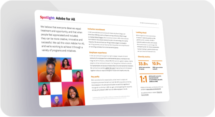5 2021 Adobe Corporate Social Responsibility Report Spotlight: Adobe for All We believe that everyone deserves equal treatment and opportunity, and that when people feel appreciated and included, they can be more creative, innovative and successful. We call this vision Adobe For All, and we’re working to achieve it through a variety of programs and initiatives. Inclusive recruitment In 2021, we established partnerships with Historically Black Colleges and Universities (HBCUs) as well as Hispanic-serving Institutions (HSIs) through our Anchor School Program . Each university received a US$1 million donation from Adobe to help prepare students for jobs in the technology and creative industries. We also continued our Hiring at Adobe program to strengthen our hiring processes, and our Diversity Talent Acquisition team stayed focused on recruiting candidates from underrepresented groups. Employee experience In 2021, we continued to support our eight employee networks that build community for employees from underrepresented groups, including the new Indigenous & First Nations at Adobe ERG. We launched a global employee allyship program, and we continued to invest in the Taking Action Initiative to accelerate the representation and success of Adobe’s Black and underrepresented employees. We continued our weeklong global D&I event bringing thousands of employees together to focus on ways to strengthen inclusion and empathy every day. Pay parity We’re committed to fair compensation, and we invest in analysis and transparency to ensure that we’re on track. We define pay parity as ensuring that employees in the same job and location are paid fairly regardless of their gender or ethnicity. In 2021, we again achieved global gender pay parity and pay parity between URM* and non-URM employees in the US. *Underrepresented minorities (URM) are defined as US employees who identify as Black/African- American, Hispanic/Latinx, Native American, Pacific Islander, and/or two or more races. Looking ahead We’ve set goals to increase representation of women in leadership positions to 30% globally by 2025, to double US URM in leadership positions by 2025, and to double Black representation as a percentage of US employees by 2025. Our diverse representation has been moving in a positive direction year over year, but we still have work to do. Diversity metrics 33.8 % global representation of women 10.9 % URM representation i n the US 1:1 global gender pay parity (women/men) and US racial/ethnic pay parity (URM/non-URM) Ad ditional information and diversit y metrics are available at www.adobe.com/diversity.html See additional details in Adobe’s FY 2021 D&I Year in Review .