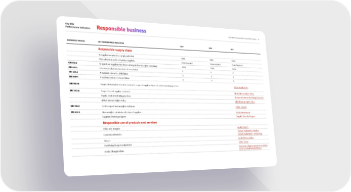 Key ESG Performance Indicators 18 2021 Adobe Corporate Social Responsibility Report Responsible business REFERENCE INDICES KEY PERFORMANCE INDICATOR 2019 2020 2021 Responsible supply chain % suppliers required to comply with RBA 100% 100% 100% RBA validation audits of turnkey suppliers None required None required None Required GRI 412-3 % significant suppliers that have undergone human rights screenings 100% 100% 100% GRI 407-1 # Incidents related to freedom of association 0 0 0 GRI 408-1 # Incidents related to child labor 0 0 0 GRI 409-1 # Incidents related to forced labor 0 0 0 GRI 102-16 Supply chain implementation standards, scope of supplier standards, and monitoring practices Adobe Supply Chain GRI 102-16 Scope of social supplier standards Global Human Rights Policy Supply chain monitoring practices Slavery and Human Trafficking Statement Global Human Rights Policy Global Human Rights Policy GRI 103-2 Tool to report human rights violations Adobe Integrity GRI 412-3 Human rights criteria in selection of suppliers Adobe Procurement Supplier Diversity program Supplier Diversity Program Responsible use of products and services Ethics and integrity Adobe Integrity Content authenticity Content Authenticity Initiative Content Authenticity—Adobe Blog Privacy Adobe Privacy Center Identifying image manipulation Adobe Sensei Adobe Changemakers Customers using our products to address social and environmental issues