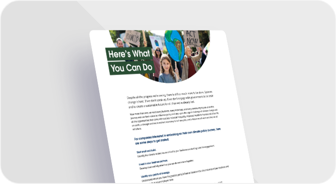 Here’s What You Can Do Despite all the progress we’re seeing, there is still so much more to be done. Systems change is hard. If we don’t speak up, if we don’t engage with governments to be bold and to create a sustainable future for all, then we’ve already lost. Now more than ever, we need every business, every individual, and every community to join us on this journey and use their voices to influence policy and step up to the urgent challenge of climate change and all the opportunities that come with success: reduced inequality, improved health for human and other life on earth, a stronger and more resilient economy full of new jobs, and a future we all want and that we all will share. For companies interested in embarking on their own climate policy journey, here are some steps to get started: Start small and build. Identify the climate-related issues critical to your business as a starting point for engagement. Invest in your business partners. Develop trust and alignment so you can do even more together. Identify your points of leverage. Understand where you have the greatest policy influence based on the circumstances of your business and sector, such as your employee base. Expand your scope. Look beyond business critical issues and advocate for science-based policies aligned to a 1.5°C. Bring others with you. We’re more powerful together than we are apart, so look for opportunities to empower others to join you. It’s Time to Act The world is in a climate crisis. To avoid the worst impacts of climate change, we must speak up and work with governments to make a 1.5°C future a reality. Learn more about Salesforce’s Climate Action Plan and how to use your voice to influence policy and step up to the urgent challenge of climate change. 7 | Salesforce.com/sustainability
