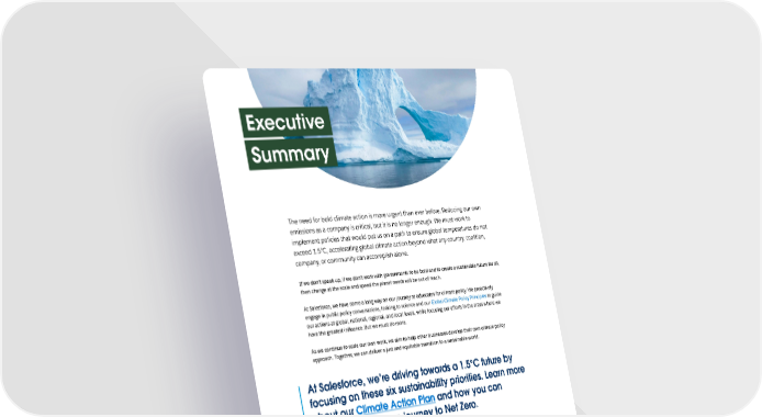 Executive Summary The need for bold climate action is more urgent than ever before. Reducing our own emissions as a company is critical, but it is no longer enough. We must work to implement policies that would put us on a path to ensure global temperatures do not exceed 1.5°C, accelerating global climate action beyond what any country, coalition, company, or community can accomplish alone. If we don’t speak up, if we don’t work with governments to be bold and to create a sustainable future for all, then change at the scale and speed the planet needs will be out of reach. At Salesforce, we have come a long way on our journey as advocates for climate policy. We proactively engage in public policy conversations, looking to science and our Global Climate Policy Principles to guide our actions at global, national, regional, and local levels, while focusing our efforts in the areas where we have the greatest influence. But we must do more. As we continue to scale our own work, we aim to help other businesses develop their own climate policy approach. Together, we can deliver a just and equitable transition to a sustainable world. At Salesforce, we’re driving towards a 1.5°C future by focusing on these six sustainability priorities. Learn more about our Climate Action Plan and how you can accelerate your own journey to Net Zero. Emissions carbon removal Trillion Trees & Education & Regulation & Innovation Reduction Ecosystem Mobilization Policy Restoration 1 | Salesforce.com/sustainability