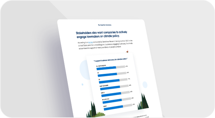 The Need for Advocacy Stakeholders also want companies to actively engage lawmakers on climate policy. According to a survey conducted by Salesforce Research during Summer 2021 in the United States and the United Kingdom, businesses engaging in advocacy for climate action have the support of nearly two-thirds of people surveyed. “I support business advocacy for climate action.” All respondents 67% US 66% UK 71% Baby boomers 68% Gen x 68% millennials 66% gen z 66% Catalyzing systemic global change is the only way to realize a future in which global temperatures do not exceed 1.5°C. To get there, we must speak up and encourage governments to develop bold policies that will help create a sustainable future for all. 3 | Salesforce.com/sustainability