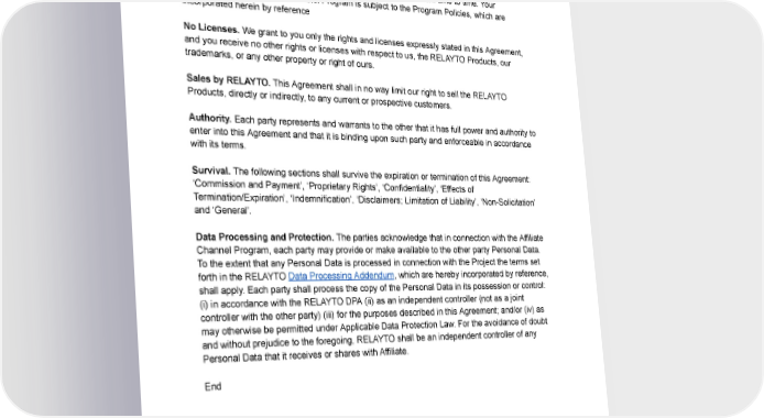 No Third Party Beneficiaries. Nothing in this Agreement, express or implied, is intended to or shall confer upon any person or entity (other than the parties hereto) any right, benefit or remedyofanynaturewhatsoever under or by reason of this Agreement. Program Policies Page. We may change the Program Policies from time to time. Your participation in the Affiliate Channel Program is subject to the Program Policies, which are incorporated herein by reference No Licenses. We grant to you only the rights and licenses expressly stated in this Agreement, andyoureceive no other rights or licenses with respect to us, the RELAYTO Products, our trademarks, or any other property or right of ours. Sales by RELAYTO. This Agreement shall in no way limit our right to sell the RELAYTO Products, directly or indirectly, to any current or prospective customers. Authority. Each party represents and warrants to the other that it has full power and authority to enter into this Agreement and that it is binding upon such party and enforceable in accordance with its terms. Survival. The following sections shall survive the expiration or termination of this Agreement: ‘Commission and Payment’, ‘Proprietary Rights’, ‘Confidentiality’, ‘Effects of Termination/Expiration’, ‘Indemnification’, ‘Disclaimers; Limitation of Liability’, ‘Non-Solicitation’ and‘General’. Data Processing and Protection. The parties acknowledge that in connection with the Affiliate Channel Program, each party may provide or make available to the other party Personal Data. To the extent that any Personal Data is processed in connection with the Project the terms set forth in the RELAYTO Data Processing Addendum, which are hereby incorporated by reference, shall apply. Each party shall process the copy of the Personal Data in its possession or control: (i) in accordance with the RELAYTO DPA (ii) as an independent controller (not as a joint controller with the other party) (iii) for the purposes described in this Agreement; and/or (iv) as mayotherwise be permitted under Applicable Data Protection Law. For the avoidance of doubt andwithout prejudice to the foregoing, RELAYTO shall be an independent controller of any Personal Data that it receives or shares with Affiliate. End