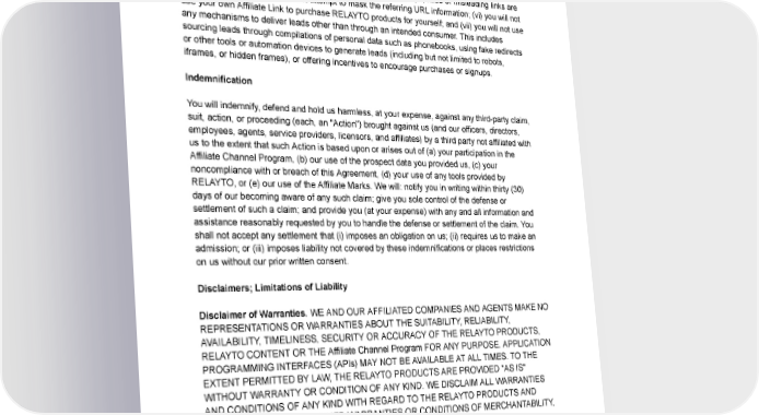 you make an Affiliate Link available); (ii) you will accurately provide all websites and domains you own where you intend to use Affiliate Links to generate Affiliate Leads; (iii) you will not purchase ads that direct to your site(s) or through an Affiliate Link that could be considered as competing with RELAYTO’s own advertising, including, but not limited to, our branded keywords; (iv) you will not participate in cookie stuffing or pop-ups, false or misleading links are strictly prohibited; (v) you will not attempt to mask the referring URL information; (vi) you will not use your own Affiliate Link to purchase RELAYTO products for yourself; and (vii) you will not use any mechanisms to deliver leads other than through an intended consumer. This includes sourcing leads through compilations of personal data such as phonebooks, using fake redirects or other tools or automation devices to generate leads (including but not limited to robots, iframes, or hidden frames), or offering incentives to encourage purchases or signups. Indemnification Youwill indemnify, defend and hold us harmless, at your expense, against any third-party claim, suit, action, or proceeding (each, an "Action") brought against us (and our officers, directors, employees, agents, service providers, licensors, and affiliates) by a third party not affiliated with us to the extent that such Action is based upon or arises out of (a) your participation in the Affiliate Channel Program, (b) our use of the prospect data you provided us, (c) your noncompliance with or breach of this Agreement, (d) your use of any tools provided by RELAYTO,or(e)ouruseoftheAffiliate Marks. We will: notify you in writing within thirty (30) days of our becoming aware of any such claim; give you sole control of the defense or settlement of such a claim; and provide you (at your expense) with any and all information and assistance reasonably requested by you to handle the defense or settlement of the claim. You shall not accept any settlement that (i) imposes an obligation on us; (ii) requires us to make an admission; or (iii) imposes liability not covered by these indemnifications or places restrictions onuswithout our prior written consent. Disclaimers; Limitations of Liability Disclaimer of Warranties. WE AND OUR AFFILIATED COMPANIES AND AGENTS MAKE NO REPRESENTATIONSORWARRANTIESABOUTTHESUITABILITY,RELIABILITY, AVAILABILITY, TIMELINESS, SECURITY OR ACCURACYOFTHERELAYTOPRODUCTS, RELAYTOCONTENTORTHEAffiliateChannelProgramFORANYPURPOSE.APPLICATION PROGRAMMINGINTERFACES(APIs)MAYNOTBEAVAILABLEATALLTIMES.TOTHE EXTENTPERMITTEDBYLAW,THERELAYTOPRODUCTSAREPROVIDED"ASIS" WITHOUTWARRANTYORCONDITIONOFANYKIND.WEDISCLAIMALLWARRANTIES ANDCONDITIONSOFANYKINDWITHREGARDTOTHERELAYTOPRODUCTSAND TOOLSINCLUDINGALLIMPLIEDWARRANTIESORCONDITIONSOFMERCHANTABILITY, FITNESSFORAPARTICULARPURPOSE,TITLEANDNON-INFRINGEMENT. No Indirect Damages. TO THE EXTENT PERMITTED BY LAW, IN NO EVENT SHALL EITHERPARTYBELIABLEFORANYINDIRECT,PUNITIVE,ORCONSEQUENTIAL DAMAGES,INCLUDINGLOSTPROFITSORBUSINESSOPPORTUNITIES.
