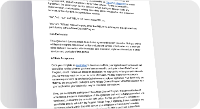 Products include all of our marketing software, legacy sales and marketing products, and any implementation, customization, training, consulting, additional support or other professional services, or fees for third-party products or services. “Subscription Service” means our web-based sales software that is subscribed to, and developed, operated, and maintained by us, accessible via http://www.relayto.com or another designated URL, and add-on products to our sales software. For the purposes of this Agreement, the Subscription Service does not include our legacy sales products, any implementation, customization, training, consulting, additional support or other professional services, or fees for third-party products or services. "We", "us", “our”, and “RELAYTO” means RELAYTO, Inc. “You” and “Affiliate” means the party, other than RELAYTO, entering into this Agreement and participating in the Affiliate Channel Program. Non-Exclusivity This Agreement does not create an exclusive agreement between you and us. Both you and we will have the right to recommend similar products and services of third parties and to work with other parties in connection with the design, sale, installation, implementation and use of similar services and products of third parties. Affiliate Acceptance Onceyoucompleteanapplication to become an Affiliate, your application will be reviewed and you will be notified whether you have been accepted to participate in the Affiliate Channel Program, or not. Before we accept an application, we may want to review your application with you, so we may reach out to you for more information. We may require that you complete certain requirements or certification(s) before we accept your application. If we do not notify you that you are accepted to participate in the Affiliate Channel Program within thirty (30) days from your application, your application may be considered to be rejected. If you are accepted to participate in the Affiliate Channel Program, then upon notification of acceptance, the terms and conditions of this Agreement shall apply in full force and effect, until terminated, pursuant to the terms set forth below. Further, you will need to complete any enrollment criteria set out in the Program Policies Page, if applicable. Failure to complete any enrollment criteria within thirty (30) days of your acceptance will result in the immediate termination of this Agreement and you will no longer be able to participate in the Affiliate Channel Program. Your acceptance and participation in the Affiliate Channel Program does not mean that you will beaccepted into any of our RELAYTO Partner Programs. In order to participate in these programs, you will need to apply in accordance with the relevant application procedure.