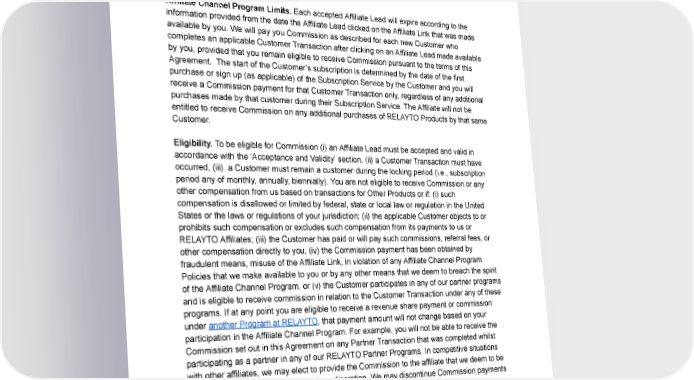 Youwill comply with the terms and conditions of this Agreement at all times, including any applicable Program Policies. CustomerTransactions Affiliate Channel Program Limits. Each accepted Affiliate Lead will expire according to the information provided from the date the Affiliate Lead clicked on the Affiliate Link that was made available by you. We will pay you Commission as described for each new Customer who completes an applicable Customer Transaction after clicking on an Affiliate Lead made available by you, provided that you remain eligible to receive Commission pursuant to the terms of this Agreement. The start of the Customer’s subscription is determined by the date of the first purchase or sign up (as applicable) of the Subscription Service by the Customer and you will receive a Commission payment for that Customer Transaction only, regardless of any additional purchases made by that customer during their Subscription Service. The Affiliate will not be entitled to receive Commission on any additional purchases of RELAYTO Products by that same Customer. Eligibility. To be eligible for Commission (i) an Affiliate Lead must be accepted and valid in accordance with the ‘Acceptance and Validity’ section, (ii) a Customer Transaction must have occurred, (iii) a Customer must remain a customer during the locking period (i.e., subscription period any of monthly, annually, biennially). You are not eligible to receive Commission or any other compensation from us based on transactions for Other Products or if: (i) such compensation is disallowed or limited by federal, state or local law or regulation in the United States or the laws or regulations of your jurisdiction; (ii) the applicable Customer objects to or prohibits such compensation or excludes such compensation from its payments to us or RELAYTOAffiliates; (iii) the Customer has paid or will pay such commissions, referral fees, or other compensation directly to you, (iv) the Commission payment has been obtained by fraudulent means, misuse of the Affiliate Link, in violation of any Affiliate Channel Program Policies that we make available to you or by any other means that we deem to breach the spirit of the Affiliate Channel Program, or (v) the Customer participates in any of our partner programs andis eligible to receive commission in relation to the Customer Transaction under any of these programs. If at any point you are eligible to receive a revenue share payment or commission under another Program at RELAYTO, that payment amount will not change based on your participation in the Affiliate Channel Program. For example, you will not be able to receive the Commission set out in this Agreement on any Partner Transaction that was completed whilst participating as a partner in any of our RELAYTO Partner Programs. In competitive situations with other affiliates, we may elect to provide the Commission to the affiliate that we deem to be the most eligible for Commission, at our discretion. We may discontinue Commission payments should any of the eligibility criteria set forth in this subsection fail to be met at any time. Acceptance and Validity. You will only be eligible for a Commission payment for any Customer Transactions that derived from Affiliate Leads generated by the Affiliate Link made available to