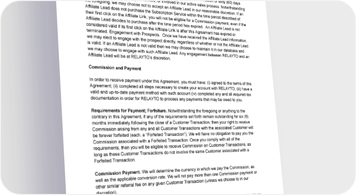 you using PartnerStack and use Link that to refer potential customers to the RELAYTO pricing website to sign up for any price plans. AnAffiliate Lead will be considered valid and accepted if, in our reasonable determination: (i) it is a new potential customer of ours, and (ii) is not, at the time of submission or sixty (60) days prior, one of our pre-existing customers, or involved in our active sales process. Notwithstanding the foregoing, we may choose not to accept an Affiliate Lead in our reasonable discretion. If an Affiliate Lead does not purchase the Subscription Service within the time period described of their first click on the Affiliate Link, you will not be eligible for a Commission payment, even if the Affiliate Lead decides to purchase after the time period has expired. An Affiliate Lead is not considered valid if its first click on the Affiliate Link is after this Agreement has expired or terminated. Engagement with Prospects. Once we have received the Affiliate Lead information, wemayelecttoengagewiththeprospectdirectly, regardless of whether or not the Affiliate Lead is valid. If an Affiliate Lead is not valid then we may choose to maintain it in our database and wemaychoosetoengagewithsuchAffiliate Lead. Any engagement between RELAYTO and an Affiliate Lead will be at RELAYTO’s discretion. CommissionandPayment In order to receive payment under this Agreement, you must have: (i) agreed to the terms of this Agreement; (ii) completed all steps necessary to create your account with RELAYTO, (iii) have a valid and up-to-date payment method with such account (iv) completed any and all required tax documentation in order for RELAYTO to process any payments that may be owed to you. Requirementsfor Payment; Forfeiture. Notwithstanding the foregoing or anything to the contrary in this Agreement, if any of the requirements set forth remain outstanding for six (6) months immediately following the close of a Customer Transaction, then your right to receive Commission arising from any and all Customer Transactions with the associated Customer will beforever forfeited (each, a “Forfeited Transaction”). We will have no obligation to pay you the Commission associated with a Forfeited Transaction. Once you comply with all of the requirements, then you will be eligible to receive Commission on Customer Transactions, as long as these Customer Transactions do not involve the same Customer associated with a Forfeited Transaction. CommissionPayment.WewilldeterminethecurrencyinwhichwepaytheCommission,as well as the applicable conversion rate. We will not pay more than one Commission payment or other similar referral fee on any given Customer Transaction (unless we choose to in our discretion). Taxes. You are responsible for payment of all taxes and fees (including bank fees) applicable to the Commission. All amounts payable by us to you are subject to offset by us against any amounts owed by you to us. Commission Amounts. We reserve the right to alter or change the Commission amount.