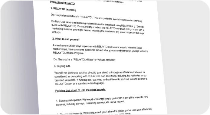 downgrade. 4. Attribution In the event a single customer clicks two different affiliate links, the last affiliate gets the credit. Wedo,however,reserve the right to modify this in certain circumstances. PromotingRELAYTO 1. RELAYTObranding Do: Capitalize all letters in “RELAYTO”. This is important to maintaining consistent branding. DoNot:Usefalseormisleading statements on the benefits of using RELAYTO (e.g. “Get rich quick with RELAYTO”). Do not modify or adjust the RELAYTO wordmark or logo in any sort of marketing material you might create, including the creation of any visual badges or dual-logo lockups. 2. What to call yourself Aswehavemultiplewaystopartner with RELAYTO and several ways to reference those relationships, here are some guidelines around what you can and cannot call yourself within the RELAYTOAffiliate Program. Do: Say you’re a “RELAYTO Affiliate" or “Affiliate Marketer”. 3. Buying ads Youwill not purchase ads that direct to your site(s) or through an affiliate link that could be considered as competing with RELAYTO’s own advertising, including, but not limited to, our branded keywords. If running ads, you need to direct the ad to your own website (and not to RELAYTO.comorastandalonelandingpage). Policies that don’t fit into the other buckets 1. Survey participation: We would encourage you to participate in any affiliate-specific NPS surveys, industry surveys, marketing surveys, etc. as we request. 2. Sharing placements: When requested, you’ll share the places you’ve used your affiliate link. This includes, but is not limited to, links, screenshots, and email sends. 3. Purchasing RELAYTO yourself: One of the benefits of the Affiliate Program is we don’t require you to purchase RELAYTO products. Though if you decide to purchase, we require that you do not use your own affiliate link.