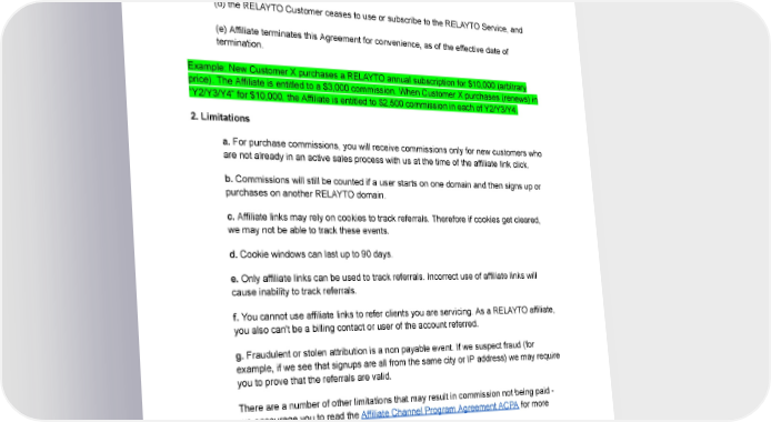 (b) this Agreement is terminated due to Affiliate’s insolvency as of the effective date of termination, (c) the RELAYTO Customer’s Transaction or Derivative Transaction, or RELAYTO Service Agreement, terminates or expires, (d) the RELAYTO Customer ceases to use or subscribe to the RELAYTO Service, and (e) Affiliate terminates this Agreement for convenience, as of the effective date of termination. Example: New Customer X purchases a RELAYTO annual subscription for $10,000 (arbitrary price). The Affiliate is entitled to a $3,000 commission. When Customer X purchases (renews) in “Y2/Y3/Y4” for $10,000, the Affiliate is entitled to $2,500 commission in each of Y2/Y3/Y4. 2. Limitations a. For purchase commissions, you will receive commissions only for new customers who are not already in an active sales process with us at the time of the affiliate link click. b. Commissions will still be counted if a user starts on one domain and then signs up or purchases on another RELAYTO domain. c. Affiliate links may rely on cookies to track referrals. Therefore if cookies get cleared, wemaynotbeabletotracktheseevents. d. Cookie windows can last up to 90 days. e. Only affiliate links can be used to track referrals. Incorrect use of affiliate links will cause inability to track referrals. f. You cannot use affiliate links to refer clients you are servicing. As a RELAYTO affiliate, you also can't be a billing contact or user of the account referred. g. Fraudulent or stolen attribution is a non payable event. If we suspect fraud (for example, if we see that signups are all from the same city or IP address) we may require you to prove that the referrals are valid. There are a number of other limitations that may result in commission not being paid - weencourageyoutoreadtheAffiliate Channel Program Agreement ACPA for more information on this. 3. Upgrades/downgrades Youreceive additional commission if a customer upgrades to a higher tiered product in the future. If a customer downgrades, you will receive the commission associated with that