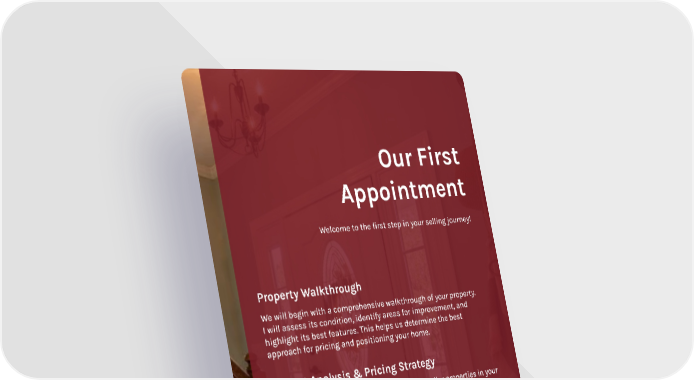 Our First Appointment Welcome to the first step in your selling journey! Property Walkthrough We will begin with a comprehensive walkthrough of your property. I will assess its condition, identify areas for improvement, and highlight its best features. This helps us determine the best approach for pricing and positioning your home. Market Analysis & Pricing Strategy I will present a detailed market analysis of similar properties in your area. We’ll review this information and discuss a pricing strategy to ensure your home is competitively positioned to attract buyers. Customized Marketing Plan I will outline a tailored marketing strategy for your property, which includes professional photography, online listings, and targeted promotions to ensure your home gets the visibility it deserves.