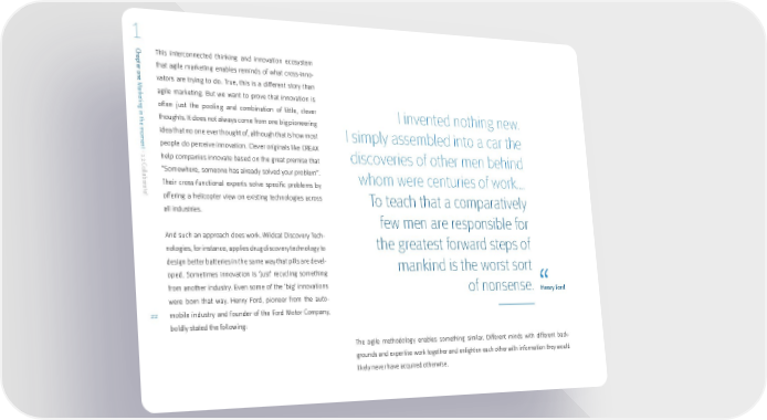 1 Ch This interconnected thinking and innovation ecosystem apt er one that agile marketing enables reminds of what cross-inno- vators are trying to do. True, this is a different story than M ark agile marketing. But we want to prove that innovation is etin often just the pooling and combination of little, clever g in the moment I invented nothing new. thoughts. It does not always come from one big pioneering idea that no one ever thought of, although that is how most I simply assembled into a car the people do perceive innovation. Clever originals like CREAX - 1.2 Chelp companies innovate based on the great premise that discoveries of other men behind o l “Somewhere, someone has already solved your problem”. l abor whom were centuries of work…. Their cross-functional experts solve specific problems by at e! offering a helicopter view on existing technologies across To teach that a comparatively all industries. few men are responsible for And such an approach does work. Wildcat Discovery Tech- the greatest forward steps of nologies, for instance, applies drug discovery technology to design better batteries in the same way that pills are devel- mankind is the worst sort oped. Sometimes innovation is ‘just’ recycling something from another industry. Even some of the ‘big’ innovations of nonsense. Henry Ford were born that way. Henry Ford, pioneer from the auto- 22 mobile industry and founder of the Ford Motor Company, boldly stated the following: The agile methodology enables something similar. Different minds with different back- grounds and expertise work together and enlighten each other with information they would likely never have acquired otherwise.