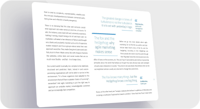 that is ruled by complexity, unpredictability, volatility and The greatest danger in times of the intricate interdependencies between connected parts, being slow and inflexible is frankly dangerous. turbulence is not the turbulence; Peter Drucker, it is to act with yesterday’s logic. author and management There is no denying that this slow and seriously consid- consultant ered approach did make sense at one time, of course. TV ads, for instance, were (and still are) extremely expensive. Getting it wrong, meant losing a lot of cold hard cash. So The fox and the marketers cultivated a low tolerance of failure and thought hedgehog: why Before we go into more details about agile very slowly and prudently–backed up by a lot of expensive marketing, let me first tell you author and stat- market research and focus groups–about what their next agile marketing istician Nate Silver’s story of the fox and the approach would be. They made (long term) plans and care- makes sense hedgehog. According to him hedgehogs are fully stuck to them. Made sense. But with cheaper channels those people who tend to see the world through like websites, online tests and social media that are so their ‘big ideas’ about the role of government, the much more flexible - and fast - it no longer does. effect of taxes on the economy, etc. They are ’type A’ personalities who believe in governing principles about the world that behave as though they were physical laws and undergird Our current world is actually too complex to be stabilized, virtually every interaction in society.” They tend to be specialized, they believe order can be structured and predicted. Static, locked in and uncom- accomplished and are usually very reluctant to change their predictions. promising organizations will not be able to survive in this environment. “It is those organisms best adapted to the The Fox knows many things, but the 2 environment that will have a greater chance of surviving” , Hedgehog knows one big thing. 9 remember? And agile marketing is just the right way to Archilochus, approach an unstable market, knowledgeable customers Greek poet and an increasingly fast competition. Foxes, on the other hand, are “scrappy creatures who believe in a plethora of little ideas and in taking a multitude of approaches toward a problem.” Silver feels that ‘foxes’ make better