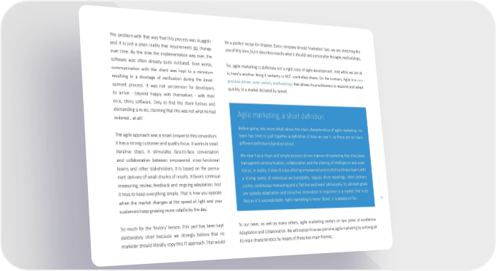 The problem with that was that this process was sluggish be a perfect recipe for disaster. Every company should ‘marketize’ (yes, we are stretching the and it is just a plain reality that requirements do change use of this term, but it describes exactly what it should) and personalize the agile methodology. over time. By the time the implementation was over, the software was often already quite outdated. Even worse, So, agile marketing is definitely not a rigid copy of agile development. And while we are at communication with the client was kept to a minimum it, here’s another thing it certainly is NOT: controlled chaos. On the contrary. Agile is a very resulting in a shortage of verification during the devel- process-driven, even orderly methodology that allows its practitioners to respond and adapt opment process. It was not uncommon for developers quickly, in a market dictated by speed. to arrive - beyond happy with themselves - with their nice, shiny software. Only to find the client furious and demanding a re-do, claiming that this was not what he had Agile marketing, a short definition ordered… at all! Before going into more detail about the main characteristics of agile marketing, my The agile approach was a smart answer to this conundrum. team has tried to pull together a definition of how we see it, as there are so many It has a strong customer and quality focus. It works in small different definitions bandied about. iterative steps. It stimulates face-to-face conversation We view it as a clean and simple process-driven manner of marketing that stimulates and collaboration between empowered cross-functional transparent communication, collaboration and the sharing of intelligence and expe- teams and other stakeholders. It is based on the perma- rience. In reality, it does this by utilizing empowered and multidisciplinary teams with nent delivery of small chunks of results. It favors continual a strong sense of individual accountability, regular short meetings, short delivery measuring, review, feedback and ongoing adaptation. And cycles, continuous measuring and a ‘fail fast and learn’ philosophy. Its ultimate goals it tries to keep everything simple. That is how you operate are speedy adaptation and proactive innovation in response to a market that is as when the market changes at the speed of light and your fast as it is unpredictable. Agile marketing is never ‘done’, it is always in flux. 11 customers keep growing more volatile by the day. So much for the ‘history’ lesson. This part has been kept To our team, as well as many others, agile marketing centers on two poles of excellence: deliberately short because we strongly believe that no Adaptation and Collaboration. We will explain how we perceive agile marketing by unifying all marketer should literally copy this IT approach. That would its main characteristics by means of these two main themes.
