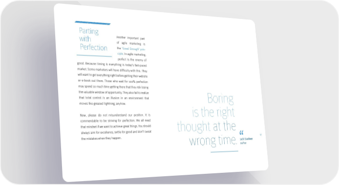 Parting with Another important part of agile marketing is Perfection the ‘Good Enough’ prin- ciple. In agile marketing, perfect is the enemy of good. Because timing is everything is today’s fast-paced market. Some marketers will have difficulty with this. They will want to get everything right before getting their website or e-book out there. Those who wait for 100% perfection may spend so much time getting there that they risk losing the valuable window of opportunity. They also fail to realize that total control is an illusion in an environment that Boring moves like greased lightning, anyhow. Now, please do not misunderstand our position. It is is the right commendable to be striving for perfection. We all need that mindset if we want to achieve great things. You should thought at the always aim for excellence, settle for good and don’t sweat the mistakes when they happen. 17 wrong time. Jack Gardner author