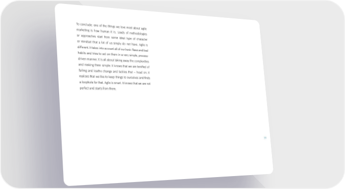 To conclude: one of the things we love most about agile marketing is how human it is. Loads of methodologies or approaches start from some ideal type of character or mindset that a lot of us simply do not have. Agile is different. It takes into account all of our basic flaws and bad habits and tries to act on them in a very simple, process- driven manner. It is all about taking away the complexities and making them simple. It knows that we are terrified of failing and loathe change and tackles that – head on. It realizes that we like to keep things to ourselves and finds a loophole for that. Agile is smart. It knows that we are not perfect and starts from there. 39