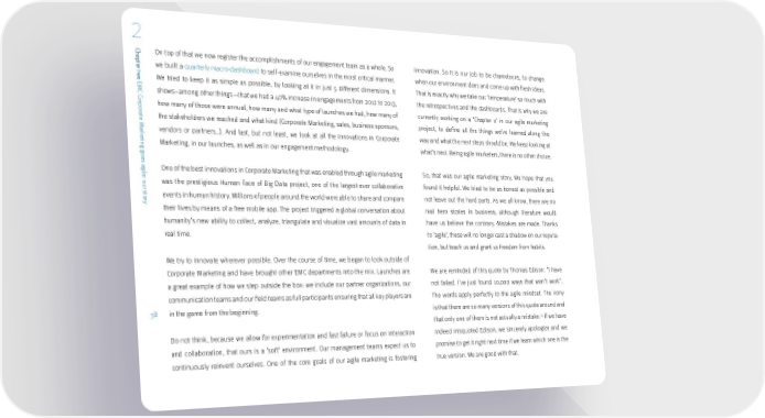 2 Ch On top of that we now register the accomplishments of our engagement team as a whole. So innovation. So it is our job to be chameleons, to change apt er tw we built a quarterly macro-dashboard to self-examine ourselves in the most critical manner. when our environment does and come up with fresh ideas. o We tried to keep it as simple as possible, by looking at it in just 5 different dimensions. It That is exactly why we take our ‘temperature’ so much with EMC shows–among other things—that we had a 40% increase in engagements from 2012 to 2013, the retrospectives and the dashboards. That is why we are C orpor how many of those were annual, how many and what type of launches we had, how many of currently working on a ‘Chapter 2’ in our agile marketing at e M the stakeholders we reached and what kind (Corporate Marketing, sales, business sponsors, project, to define all the things we’ve learned along the ark vendors or partners…). And last, but not least, we look at all the innovations in Corporate way and what the next steps should be. We keep looking at etin Marketing, in our launches, as well as in our engagement methodology. what’s next. Being agile marketers, there is no other choice. g g oe s agi One of the best innovations in Corporate Marketing that was enabled through agile marketing So, that was our agile marketing story. We hope that you l e: our swas the prestigious Human Face of Big Data project, one of the largest-ever collaborative found it helpful. We tried to be as honest as possible and t or events in human history. Millions of people around the world were able to share and compare not leave out the hard parts. As we all know, there are no y their lives by means of a free mobile app. The project triggered a global conversation about real hero stories in business, although literature would humanity’s new ability to collect, analyze, triangulate and visualize vast amounts of data in have us believe the contrary. Mistakes are made. Thanks real time. to ’agile’, these will no longer cast a shadow on our reputa- tion, but teach us and grant us freedom from habits. We try to innovate wherever possible. Over the course of time, we began to look outside of Corporate Marketing and have brought other EMC departments into the mix. Launches are We are reminded of this quote by Thomas Edison: “I have a great example of how we step outside the box: we include our partner organizations, our not failed. I’ve just found 10,000 ways that won’t work”. communication teams and our field teams as full participants ensuring that all key players are The words apply perfectly to the agile mindset. The irony 38 in the game from the beginning. is that there are so many versions of this quote around and 14 that only one of them is not actually a mistake. If we have Do not think, because we allow for experimentation and fast failure or focus on interaction indeed misquoted Edison, we sincerely apologize and we and collaboration, that ours is a ‘soft’ environment. Our management teams expect us to promise to get it right next time if we learn which one is the continuously reinvent ourselves. One of the core goals of our agile marketing is fostering true version. We are good with that.