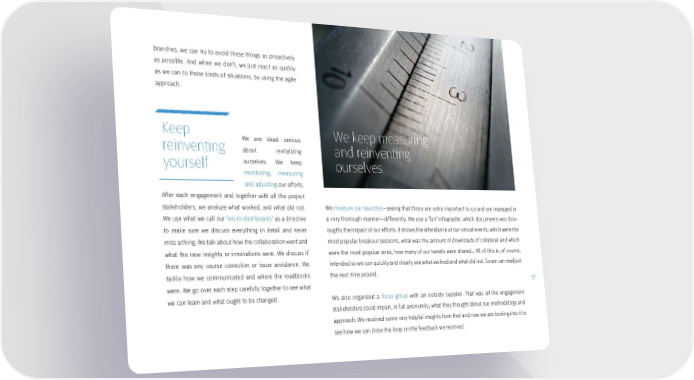 branches, we can try to avoid these things as proactively as possible. And when we don’t, we just react as quickly as we can to those kinds of situations, by using the agile approach. Keep We keep measuring We are dead serious reinventing about revitalizing and reinventing yourself ourselves. We keep ourselves monitoring, measuring and adjusting our efforts. After each engagement and together with all the project stakeholders, we analyze what worked, and what did not. We measure our launches–seeing that those are extra important to us and are managed in We use what we call our ‘micro-dashboards’ as a directive a very thorough manner—differently. We use a ‘fun’ infographic which documents very thor- to make sure we discuss everything in detail and never oughly the impact of our efforts. It shows the attendance at our virtual events, which were the miss a thing. We talk about how the collaboration went and most popular breakout sessions, what was the amount of downloads of collateral and which what the new insights or innovations were. We discuss if were the most popular ones, how many of our tweets were shared… All of this is, of course, there was any course correction or issue avoidance. We intended so we can quickly and clearly see what worked and what did not. So we can readjust tackle how we communicated and where the roadblocks the next time around. 37 were. We go over each step carefully together to see what we can learn and what ought to be changed. We also organized a focus group with an outside supplier. That way all the engagement stakeholders could impart, in full anonymity, what they thought about our methodology and approach. We received some very helpful insights from that and now we are looking into it to see how we can close the loop on the feedback we received.