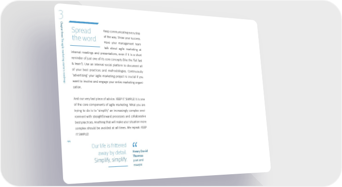 3 Ch apt er thrSpread Keep communicating every step ee of the way. Show your success. The agithe word Have your management team l talk about agile marketing at e m ark internal meetings and presentations, even if it is a short etin reminder of just one of its core concepts (like the ‘fail fast g s t ar & learn’). Use an internal social platform to document all t er’s of your best practices and methodologies. Continuously r o a ‘advertising’ your agile marketing project is crucial if you dm ap want to involve and engage your entire marketing organi- zation. And our very last piece of advice: KEEP IT SIMPLE! It is one of the core components of agile marketing. What you are trying to do is to ‘simplify’ an increasingly complex envi- ronment with straightforward processes and collaborative best practices. Anything that will make your situation more complex should be avoided at all times. We repeat: KEEP IT SIMPLE! 44 Our life is frittered away by detail. Henry David Simplify, simplify. Thoreau poet and essayist