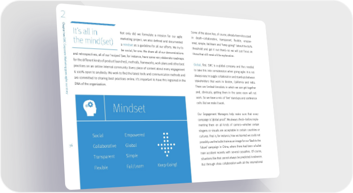 2 Ch Some of the above has, of course, already been discussed apt er tw It’s all in Not only did we formulate a mission for our agile in depth–collaborative, transparent, flexible, empow- o marketing project, we also defined and documented ered, simple, fail/learn and “keep going!” (about the 80% EMC the mind(set) a mindset as a guideline for all our efforts. We try to threshold and get it out there)–so we will just focus on C orpor be social, for one. We share all of our demonstrations those that still need a little explanation. at e M and retrospectives, all of our ‘recipes’ (we, for instance, have some very elaborate roadmaps ark for the different kinds of product launches), methods, frameworks, work plans and other best Global, first. EMC is a global company and thus needed etin practices on an online internal community. Every piece of content about every engagement to take this into consideration when going agile. It is not g g oe is 100% open to anybody. We work to find the latest tools and communication methods and always easy to juggle collaboration and standups between s agi are committed to sharing best practices online. It’s important to have this ingrained in the stakeholders that work in Boston, California and India. l e: our sDNA of the organization. There are limited timeslots in which we can get together t or and, obviously, getting them in the same room will not y work. So we have a mix of ‘live’ standups and conference Mindset calls. But we make it work. Our Engagement Managers help make sure that every campaign is ‘global proof’. We always check–before imple- menting them on all kinds of carriers—whether certain slogans or visuals are acceptable in certain countries or Social Empowered cultures. That is, for instance, how we learned we could not 36 Collaborative Global possibly use the bullet train as an image for our ‘Back to the future’ campaign in China, where there had been a bullet Transparent Simple train accident recently with several casualties. Of course, situations like that cannot always be predicted in advance. Flexible Fail/Learn Keep Going! But through close collaboration with all the international