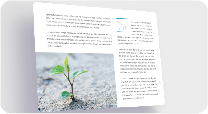 Agile marketing is not ‘just’ a methodology that you can implement in order to collaborate When you want to introduce culture better, react faster or become more innovative. It is a fundamental culture shift. According to Start changes it is essential that you Tobias Mayer, author of ‘The People’s Scrum: Agile Ideas for Revolutionary Transformation’, small start small–like we did, with a pilot Scrum is much more about changing the way we think than it is a process. project–and then carry on, step by step. In fact, this is not just one of So, as with every change management project, make sure to involve your stakeholders as the basics of change, but of ‘agile’ as well: work step by soon as you can, even before formulating the change objectives and the way to get there. In step, in short cycles and, after every deliverable, re-eval- the collaborative environment that is agile marketing, that’s how you should work anyway. Do uate and change course, if needed. not just ‘throw’ agile marketing at your marketing department. This will just make adapting it all the more harder. The good thing about that is, that you only need to really ‘convince’ the first group of the pilot project. They will be the hardest sell. But once that project is over, and it was (more or less) a success, the next project will encounter less resistance. Because you will be able to show what you have achieved. Results speak so much louder than motiva- tional words and promises. So always catalogue your proof points and your successes for further use. Of course, there is a slight chance that your first pilot project will fail, possibly even miserably. Be prepared for 43 that. But do not get discouraged. That too, is ‘agile’. Get back up on your feet, brush yourself off and try to find out what exactly went wrong. Measure your mistakes, analyze their source, learn from that and try to adapt your personal agile marketing methodology to it.