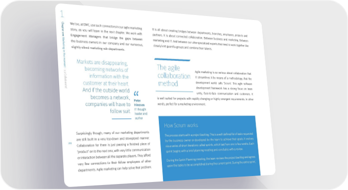 1 Ch We too, at EMC, use such connectors in our agile marketing It is all about creating bridges between departments, branches, employees, projects and apt er one story, as you will learn in the next chapter. We work with partners. It is about connected collaboration. Between business and marketing. Between Engagement Managers that bridge the gaps between marketing and IT. And between our ultra-specialized experts that need to work together like M ark the business owners in our company and our numerous, closely knit guerrilla groups and combine their talents. etin slightly siloed marketing sub-departments. g in the moment Markets are disappearing, The agile - 1.2 C becoming networks of Agile marketing is so serious about collaboration that collaboration it streamlines it by means of a methodology, that the o l information with the l abor method development world calls ‘Scrum’. This agile software at customer at their heart. e! And if the outside world development framework has a strong focus on team unity, face-to-face communication and customers. It becomes a network, is well suited for projects with rapidly changing or highly emergent requirements. In other Peter companies will have to Hinssen words, perfect for a marketing environment. follow suit. IT thought leader and author How Scrum works Surprisingly though, many of our marketing departments are still built in a very top-down and stovepiped manner. The process starts with a project backlog. This is a well-defined list of tasks requested 20 by the business owner or developed by the team to achieve their goals. It evolves Collaboration for them is just passing a finished piece of via a series of short iterations called sprints, which last from one to four weeks. Each ‘product’ on to the next one, with very little communication sprint begins with a brief planning meeting and concludes with a review. or interaction between all the separate players. They afford very few connections to their fellow employees of other During the Sprint Planning meeting, the team reviews the project backlog and agrees departments. Agile marketing can help solve that problem. upon the tasks to be accomplished during the current sprint. During the entire sprint,