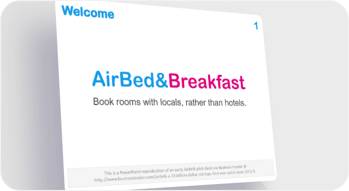 Welcome 1 AirBed&Breakfast Book rooms with locals, rather than hotels. This is a PowerPoint reproduction of an early AirBnB pitch deck via Business Insider @ http://www.businessinsider.com/airbnb-a-13-billion-dollar-startups-first-ever-pitch-deck-2011-9