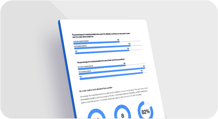 The percentage of marketing leaders who report it’s ‘slightly, moderately, or very easy’ to make real-time, data-driven decisions. Do not use no code/low code tools 66% Use no code/low code tools 82% Total 79% Thiepiafici gielfem akiifcgeli diaweohleaiplaieihifaeolakflowe aieieffici Do not use no code/low code tools 55% Use no code/low code tools 79% Total 7% No code makes tool adoption less painful On average, the marketing leaders we polled use 20 marketing tools on a regular basis. This year’s report found that marketing leaders added an average of 8 tools to their stacks in the past 8 months, and 82% of marketing leaders expect the number of tools their teams use regularly will increase over the next 12 months. 20 8 82= The number of tools marketing Number of tools leaders added of leaders expect the number teams use on a regular basis. in the last 12 months. of tools to increase oEer the next In 2021, this number was 26. 12 months. According to the Marketing Technology Landscape, and focus their budgets on iterative growth, rather than there are 9,932 marketing technology solutions currently huge transformations. What’s already changing, however, available, up 24% from 2020. How organizations navigate are the types of tools marketing teams are adopting, this landscape will likely change as inflation continues to and how they’re connecting data and information across rise—we expect teams to consolidate tools to cut costs; these tools. choose flexibility over rigid, use-case-specific solutions; 22 Airtable 2022 Marketing trends report