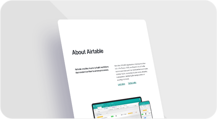 About Airtable Airtable enables teams to build workflows More than 300,000 organizations, including more than that modernize their business processes. half of the Fortune 1000, use Airtable’s visual, flexible tools to customize workflows that meet their exact needs, whether they’re creating blockbuster movies, designing running shoes, distributing life-saving vaccines, or anything in between. Learn more Contact sales 30 Airtable 2022 Marketing trends report