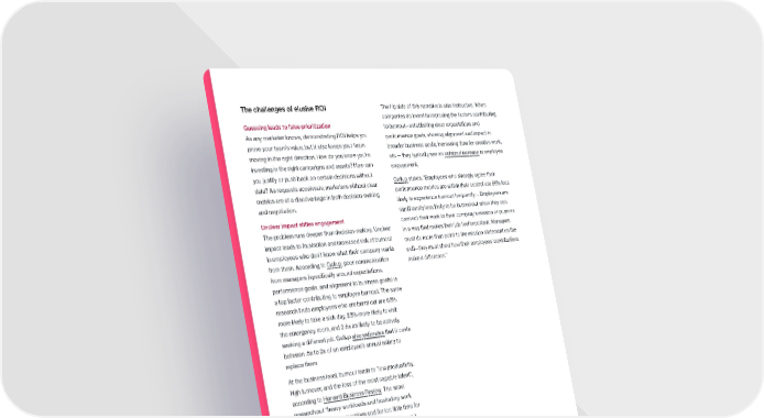 The challenges of elusive ROI The flip side of this narrative is also instructive. When companies do invest in improving the factors contributing Guessing leads to false prioritization to burnout—establishing clear expectations and As any marketer knows, demonstrating ROI helps you performance goals, showing alignment and impact to prove your team’s value, but it also keeps your team broader business goals, increasing time for creative work, moving in the right direction. How do you know you’re etc.— they typically see an outsized increase in employee investing in the right campaigns and assets? How can engagement. you justify or push back on certain decisions without data? As requests accelerate, marketers without clear Gallup states: “Employees who strongly agree their metrics are at a disadvantage in both decision-making performance metrics are within their control are 55% less and negotiation. likely to experience burnout frequently … Employees are significantly less likely to be burned out when they can Unclear impact stifles engagement connect their work to their company’s mission or purpose The problem runs deeper than decision-making. Unclear in a way that makes their job feel important. Managers impact leads to frustration and increased risk of burnout must do more than point to the mission statement on the in employees who don’t know what their company wants wall—they must show how their employees’ contributions from them. According to Gallup, poor communication make a difference.” from managers (specifically around expectations, performance goals, and alignment to business goals) is a top factor contributing to employee burnout. The same research finds employees who are burnt out are 63% more likely to take a sick day, 23% more likely to visit the emergency room, and 2.6x as likely to be actively seeking a different job. Gallup also estimates that it costs between .5x to 2x of an employee’s annual salary to replace them. At the business level, burnout leads to “low productivity, high turnover, and the loss of the most capable talent”, according to Harvard Business Review. The same research put “heavy workloads and frustrating work routines of too many meetings and far too little time for creative work” as key contributing factors to burnout. Notably, this report shows marketing leaders face these challenges daily. 8 Airtable 2022 Marketing trends report