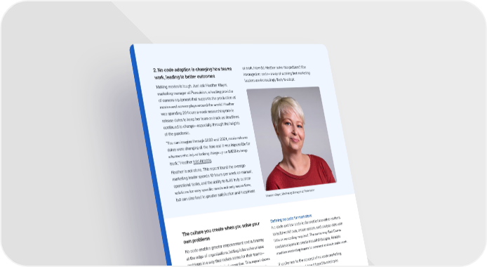 2. No code adoption is changing how teams at work. How did Heather solve this problem? She work, leading to better outcomes leveraged no code—a way of working that marketing leaders are increasingly likely to adopt. Making movies is tough. Just ask Heather Mayer, marketing manager at Panavision, a leading provider of camera equipment that supports the production of movies and screen plays around the world. Heather was spending 20 hours a week researching movie release dates to keep her team on track as deadlines continued to change—especially through the heights of the pandemic. “You can imagine through 2020 and 2021, movie release dates were changing all the time and it was impossible for a human who is just looking things up on IMDB to keep track,” Heather told Airtable. Heather is not alone. This report found the average marketing leader spends 10 hours per week on manual, operational tasks, and the ability to build truly custom solutions for very specific needs not only saves time, but can also lead to greater satisfaction and happiness Heather Mayer, Marketing Manager at Panavision The culture you create when you solve your Defining no code for marketers own problems No code and low code tools enable innovative workers to build workflows, create assets, and analyze data with No code enables greater empowerment and autonomy little or no coding required. The same way that Canva at the edge of organizations, letting folks solve unique enables anyone to create beautiful designs, Airtable problems in a way that makes sense for their teams— enables marketing teams to connect and automate work. without relying on technical expertise. This report shows that more and more marketing teams are adopting no If you’re new to the concept of no code marketing, code technologies and, in doing so, they’re transforming discover more about how it benefits employee their culture to one of adaptability and agility. engagement and how to introduce it at large Specifically, 59% of respondents who use no code organizations in this Airtable blog post featuring said that the adoption has made them more adaptable Panavision and Scott Brinker. to changing business needs, and 54% cited tool customization, made possible through no code, as a key benefit. Without no code tools, managing ever-changing data points and marketing conditions typically leads to more manual work. With no code, those closest to the work are empowered to build and evolve processes so the organization can quickly adapt to change without breaking stride. 20 Airtable 2022 Marketing trends report