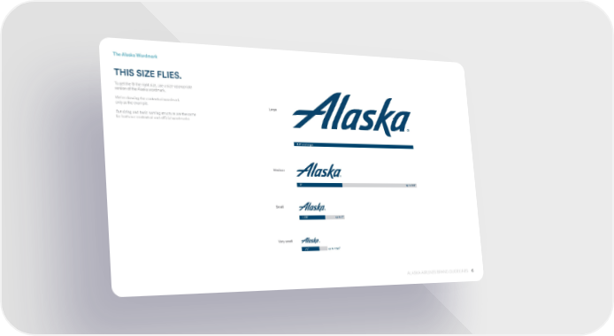 6 ALASKA AIRLINES BRAND GUIDELINES The Alaska Wordmark THIS SIZE FLIES. To get the ® the right size, use a size-appropriate version of the Alaska wordmark. We’re showing the contextual wordmark only as the example. But sizing and basic naming structure are the same for both our contextual and official wordmarks. Large Medium Small Very small