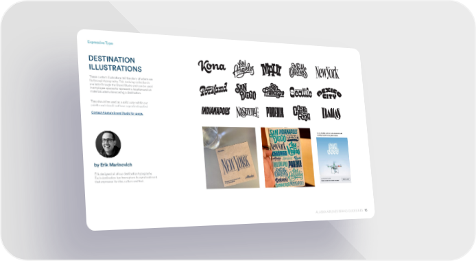 16 ALASKA AIRLINES BRAND GUIDELINES Expressive Type DESTINATION ILLUSTRATIONS These custom illustrations tell the story of where we fly through typography. This evolving collection is available through the Brand Studio and can be used in employee spaces to represent a location and on materials when showcasing a destination. They should be used as a solid color within our palette and should not have a gradient applied. Contact Alaska’s Brand Studio for usage. Erik designed all of our destination typography. Each destination has been given its own treatment that expresses its vibe, culture and feel. by Erik Marinovich