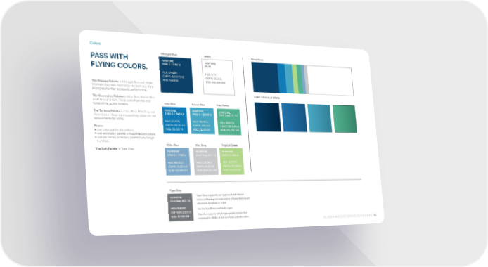 10 ALASKA AIRLINES BRAND GUIDELINES Colors PASS WITH FLYING COLORS. The Primary Palette is Midnight Blue and White. Midnight Blue was inspired by the night sky. It’s a strong neutral that represents performance. The Secondary Palette is Atlas Blue, Breeze Blue and Tropical Green. These come from the mid- tones of the aurora borealis. The Tertiary Palette is Calm Blue, Mist Gray and Palm Green. These core supporting colors are not replacements for white. Never: • Use color just for decoration. • Use secondary palette without the core colors. • Use secondary or tertiary palette in exchange for White. The Soft Palette is Type Gray. PANTONE 7694 C / 2187 U HEX: 01426A CMYK: 100.57.9.52 RGB: 1.66.106 PANTONE (N/A) HEX: FFFFF CMYK: 0.0.0.0. RGB: 255.255.255 Midnight Blue White PANTONE 2383 C / 7461 U HEX: 2774AE CMYK: 83.40.3.6 RGB: 39.116.174 PANTONE 7702 C / 2200 U HEX: 48A9C5 CMYK: 68.1.8.8 RGB: 72.169.197 Atlas Blue Breeze Blue PANTONE 2284 C/ 366 U HEX: B3D57D CMYK: 33.0.60.0 RGB: 179.213.125 Tropical Green PANTONE 2156 C / 2155 U HEX: 8BA6C1 CMYK: 51.23.11.0 RGB: 139.166.193 Calm Blue Mist Gray Type Gray PANTONE Cool Gray 3 C / U HEX: C8C9C7 CMYK: 8.5.7.16 RGB: 200.201.199 PANTONE Cool Gray 9 C / U HEX: 656565 CMYK:30.22.17.57 RGB: 117.120.123 Palm Green PANTONE Cool Gray 9 C / U HEX: B3D57D CMKY: 33. 0. 60. 0 RGB: 179. 213. 125 Type Gray supports our approachable brand voice, softening our expression of type that would otherwise be black in color. Use for headlines and body copy. Also for cases in which typography cannot be reversed to White or set in a Core palette color. Proportions Brand colors as gradients