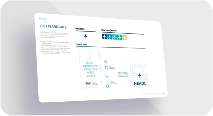 19 ALASKA AIRLINES BRAND GUIDELINES Mini Plane JUST PLANE CUTE. The airplane icon is a simplified visual representation of Alaska’s overall fleet of aircraft. We took inspiration from various airplane types to land on the newest version of the icon. • Airplane icon should always be the color of the typography used. • Icon width should be the letterform width. • If space permits, airplane icon should have 2x the space from the top compared to the headline. • When between airport codes, the airplane should be the same height as the font. 31 BRAND PLANE ICON: USAGE New Icon New Icon (white) Use of Icon ● Airplane icon should always be the color of the typography used. ● Icon width should be the letterform width. ● If space permits, airplane icon should have 2x the space from the top compared to the headline. ● When between airport codes, the airplane should be the same height as the font. OOH LENGTH OF 1 LETTERFORM PRINT LENGTH OF 2 LETTERFORMS HEADL The airplane icon is a simplified visual representation of Alaska’s overall fleet of aircraft. We took inspiration from various airplane types to land on the newest version of the plane icon. AIRPLANE IS THE SAME HEIGHT AS THE CODE
