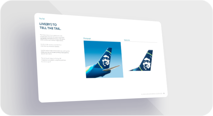 9 ALASKA AIRLINES BRAND GUIDELINES The Tail LIVE(RY) TO TELL THE TAIL. The Alaska livery is our largest and most recognizable element. It’s a piece of art that represents all of Alaska Air Group. We have a photo version and a vector image version. Use the photo version, supported by a clear blue sky, whenever possible. Use the vector image version when you can’t use the photo, such as on a screen printing, large graphics, apparel and merch. The tail should always be facing left. Cropping is acceptable, using the guidelines found on page 8. Photograph Vector Art