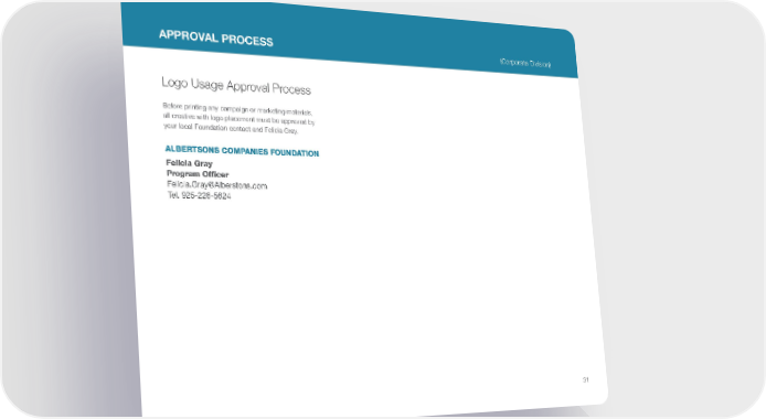 APPROVAL PROCESS (Corporate Division) Logo Usage Approval Process Before printing any campaign or marketing materials, all creative with logo placement must be approved by your local Foundation contact and Felicia Gray. ALBERTSONS COMPANIES FOUNDATION Felicia Gray Program Officer Felicia.Gray@Alberstons.com Tel. 925-226-5624 31