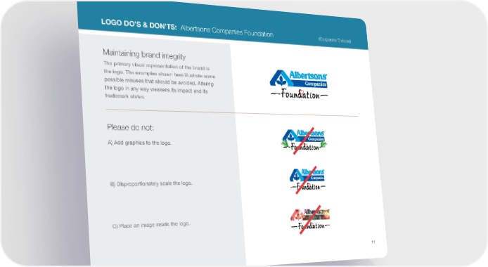 LOGO DO’S & DON’TS: Albertsons Companies Foundation (Corporate Division) Maintaining brand integrity The primary visual representation of the brand is the logo. The examples shown here illustrate some possible misuses that should be avoided. Altering the logo in any way weakens its impact and its trademark status. Please do not: A) Add graphics to the logo. B) Disproportionately scale the logo. C) Place an image inside the logo. 11