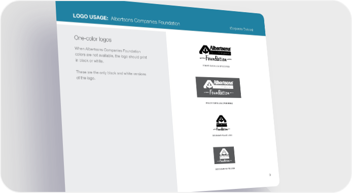 LOGO USAGE: Albertsons Companies Foundation (Corporate Division) One-color logos When Albertsons Companies Foundation colors are not available, the logo should print in black or white. PRIMARY BLACK LOGO (PREFERRED) These are the only black and white versions of the logo. PRIMARY WHITE LOGO (PREFERRED) SECONDARY BLACK LOGO SECONDARY WHITE LOGO 9