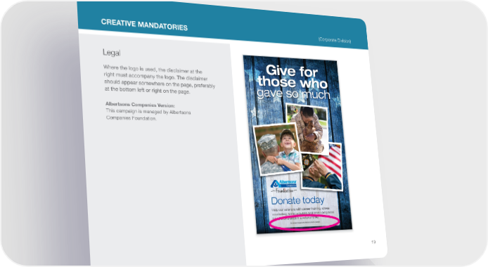 19 (Corporate Division) CREATIVE MANDATORIES Legal Where the logo is used, the disclaimer at the right must accompany the logo. The disclaimer should appear somewhere on the page, preferably at the bottom left or right on the page. Albertsons Companies Version: This campaign is managed by Albertsons Companies Foundation.