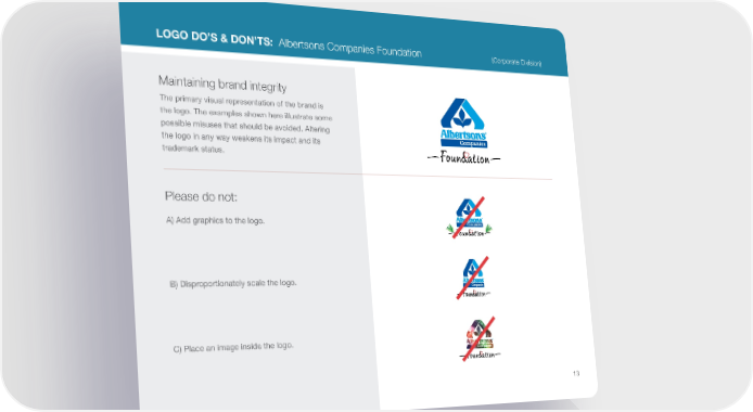 13 (Corporate Division) LOGO DOS & DONTS: Albertsons Companies Foundation Maintaining brand integrity Please do not: The primary visual representation of the brand is the logo. The examples shown here illustrate some possible misuses that should be avoided. Altering the logo in any way weakens its impact and its trademark status. A) Add graphics to the logo. B) Disproportionately scale the logo. C) Place an image inside the logo.