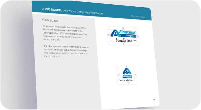 10 (Corporate Division) LOGO USAGE: Albertsons Companies Foundation Clear space As shown in the example, the clear space of the Albertsons logo is equal to the height of the uppercase letter A in the word Albertsons. This measurement extends from the baseline to the top of the art. The clear space of the secondary logo is equal to the height of the top leaf of the Albertsons logo. This measurement extends from the baseline to the top of the art.