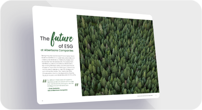 f utur e The of ESG Recognizing the importance of Environmental Social Governance (ESG) to our customers, associates, and investors, we refreshed our Materiality Assessment to prioritize how we address ESG. This assessment identified our internal and external stakeholder’s top-ranking ESG topic areas, and the outcome has shaped our bold vision for the future. In the coming months, we will release our new ESG strategy and commitment for the four Tier 1 topics identified: Climate Action, Community Stewardship, Diversity, Equity & Inclusion, and Waste Reduction & Circularity. at Albertsons Companies – Vivek Sankaran, CEO of Albertsons Companies Our efforts in these areas will support a healthier planet and vibrant communities, and I look forward to sharing our new ESG strategy and commitments soon. 30 Environmental Social Governance Report 2020 31