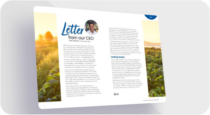 2020 was a year of transformation for many, and our company was no exception. The events of last year brought to the surface the positive impact our company has on our customers and communities. I would like to thank each of our 300,000 associates for their unwavering commitment to serving our communities during such unprecedented times. Throughout the pandemic, our teams acted swiftly to implement in-store safety measures, keep food and supplies on the shelves for customers, and distribute COVID-19 vaccinations in partnership with the Department of Health and Human Services. As our communities faced rising food insecurity, Albertsons Companies, the Albertsons Companies Foundation Nourishing Neighbors program, and our customers stepped up to help those in need. We set a record $260 million in food and monetary donations to aid hunger relief organizations in our local communities. This helped us reach 13 million individuals and over 3,000 organizations. When acts of racism and inequity shook our communities, we came together as a company to support one another and stand united in the face of prejudice, hatred, and intolerance. We are committed to equality and are driven by our guiding principle to be a diverse and inclusive team. Le�er from our CEO Vivek Sankaran | Chief Executive Officer I’m proud that over the past year we have not only increased our diverse representation at all levels of the company, but have also prioritized Diversity, Equity, and Inclusion training, created opportunities to have courageous conversations, and outlined a framework to continue to improve. As part of these efforts, we committed $5 million to social justice & equality causes. In the face of these challenges, our teams still made meaningful progress to reduce our impact on the environment. As part of this, we recently announced our commitment to setting a science-based target to reduce carbon emissions. This broadens our existing environmental commitments, which include making 100% of our Own Brands packaging recyclable, reusable, or industrially compostable by 2025. Looking Ahead In 2020, we completed a new materiality assessment, which will be the foundation for our Environmental Social Governance (ESG) strategy and initiatives going forward. Through this process we identified high priority areas that align with our long-term company strategy and are most critical to our stakeholders, including Climate Action, Community Stewardship, Diversity, Equity & Inclusion, and Waste Reduction & Circularity. I am encouraged by the progress we made in 2020, as it established a framework from which we can accelerate our efforts. We have a bold vision for the future and will soon be launching commitments with specific metrics to measure our progress. I invite you to learn more about our progress in 2020 in this report, and I look forward to sharing more with you in the coming months. Vivek 6 Environmental Social Governance Report 2020 7 Letter