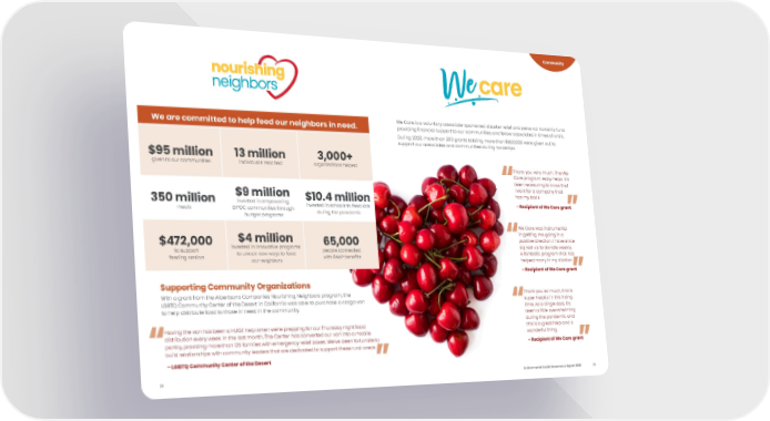 Supporting Community Organizations With a grant from the Albertsons Companies Nourishing Neighbors program, the LGBTQ Community Center of the Desert in California was able to purchase a cargo van to help distribute food to those in need in the community. $95 million given to our communities 13 million individuals reached 3,000+ organizations helped 350 million meals $9 million invested in empowering BIPOC communities through hunger programs $10.4 million invested in schools to feed kids during the pandemic $472,000 to support feeding seniors $4 million invested in innovative programs to unlock new ways to feed our neighbors 65,000 people connected with SNAP benefits – LGBTQ Community Center of the Desert Having the van has been a HUGE help when we’re prepping for our Thursday night food distribution every week. In the last month, The Center has converted our van into a mobile pantry, providing more than 125 families with emergency relief boxes. We’ve been fortunate to build relationships with community leaders that are dedicated to support these rural areas. We Care is a voluntary associate-sponsored disaster relief and personal hardship fund providing financial support to our communities and fellow associates in times of crisis. During 2020, more than 300 grants totaling more than $800,000 were given out to support our associates and communities during hardships. – Recipient of We Care grant We Care was instrumental in getting me going in a positive direction. I have since signed up to donate weekly. A fantastic program that has helped many in my division. – Recipient of We Care grant Thank you very much. The We Care program really helps. It’s been reassuring to know that I work for a company that has my back. – Recipient of We Care grant Thank you so much, this is super helpful in this trying time. As a single dad, it's been a little overwhelming during the pandemic and this is a great help and a wonderful thing. We are committed to help feed our neighbors in need. 28 Environmental Social Governance Report 2020 29 Community