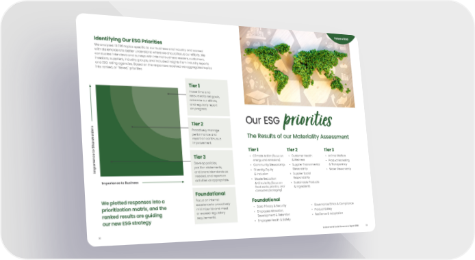 • Data Privacy & Security • Employee Attraction, Development & Retention • Employee Health & Safety • Governance Ethics & Compliance • Product Safety • Resilience & Adaptation The Results of our Materiality Assessment priorities Our ESG Foundational Tier 1 • Climate Actio n (focus on energy and emissions) • Community Stewardship • Diversity, Equity & Inclusion • Waste Reduction & Circularity (focus on food waste, plastics, and consumer packaging) Tier 2 • Customer Health & Wellness • Supplier Environmental Stewardship • Supplier Social Responsibility • Sustainable Products & Ingredients Tier 3 • Animal Welfare • Product Marketing & Transparency • Water Stewardship Identifying Our ESG Priorities We analyzed 19 ESG topics specific to our business and industry and worked with stakeholders to better understand where we should focus our efforts. We conducted interviews and surveys with internal business leaders, customers, investors, suppliers, industry groups, and included insights from industry reports and ESG rating agencies. Based on the responses received we aggregated topics into ranked, or "tiered," priorities. We plotted responses into a prioritization matrix, and the ranked results are guiding our new ESG strategy Tier 1 Invest time and resources to set goals, advance our efforts, and regularly report on progress. Tier 3 Develop policies, position statements, and brand standards as needed, and report on activities as appropriate. Foundational Focus on internal excellence to proactively minimize risk and meet or exceed regulatory requirements. Tier 2 Proactively manage performance and report on continuous improvement. Importance to Business Importance to Shareholders 32 Environmental Social Governance Report 2020 33 Future of ESG